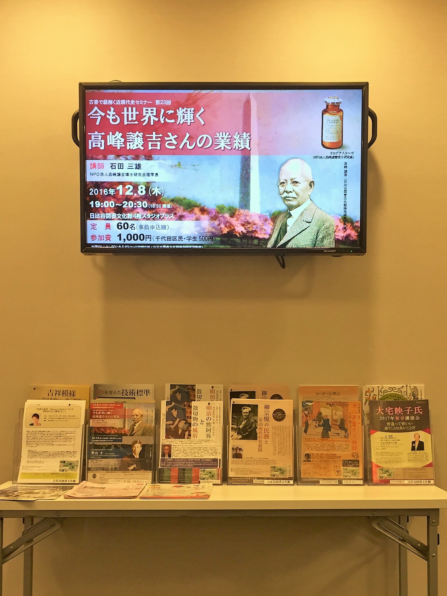 また、平成28年10月18日~12月28日まで、企画展示「国際人としての生き方 ~大航海時代から昭和戦前まで~」が開催されています。去る12月8日、これらの関連講座として「古書で紐解く近現代史セミナー第23回 今も世界に輝く高峰譲吉さんの業績」にて当研究会の石田理事長が講演をしました。