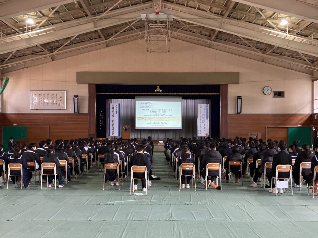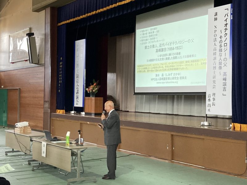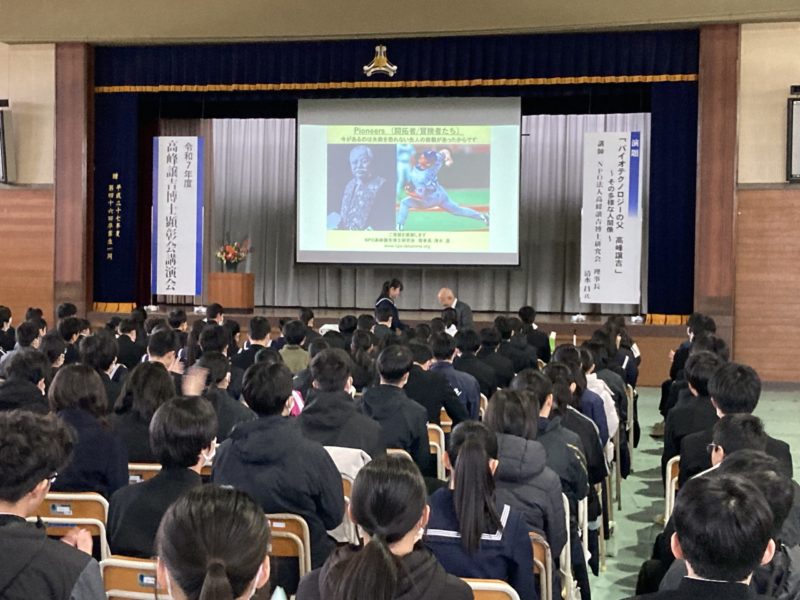 体育館では、自発的に挨拶をしてくれる生徒が多く、真剣に耳を傾ける姿が印象的でした。地元ゆかりの偉人である高峰譲吉の探究心に触れ、郷土への理解と学問への関心を深める良い機会となりました。
