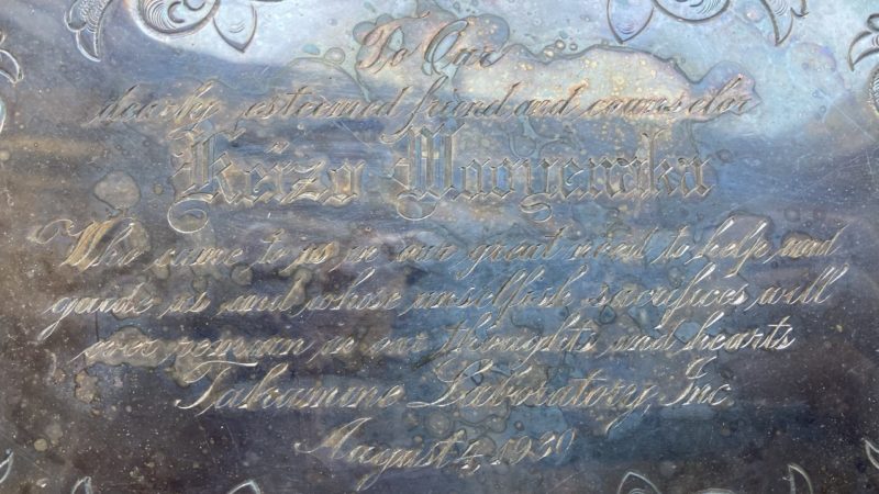 今回の訪問の目的は、2026年6月に予定されているイベントの展示物の打ち合わせです。打ち合わせ後、候補展示物の一つである「高峰ラボラトリーから上中啓三へ贈られた銀の大皿」に刻まれたメッセージの解読に、学芸員の山岸氏とともに取り組みました。イベントの詳細と解読結果については、改めてご報告いたします。