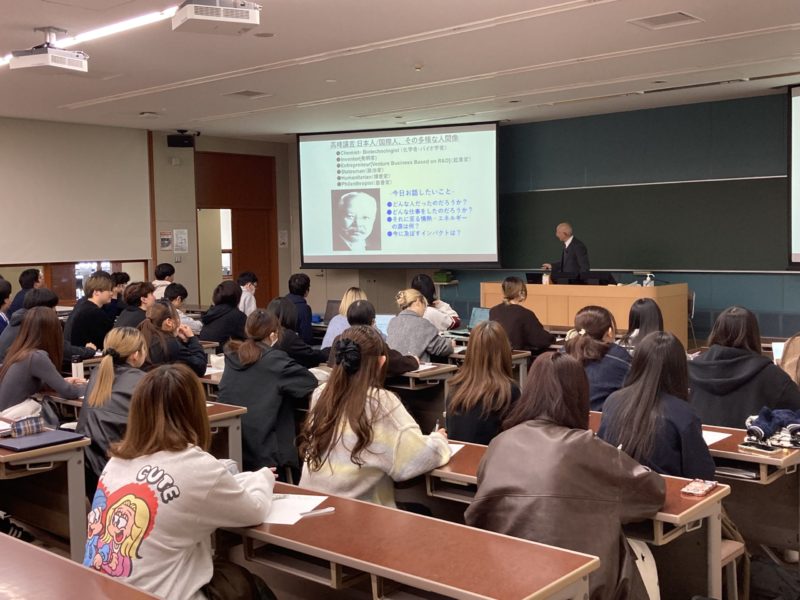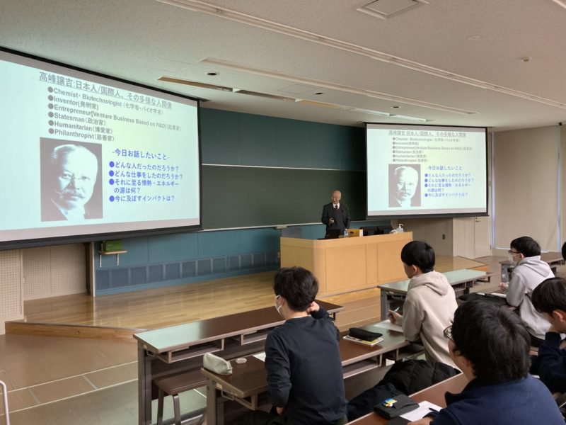今年は教室の構造上、途中から清水理事長も学生と同じ列に座り、スクリーンを見ながら講義を進める形となりました。目線の高さがそろうことで一体感が生まれ、講演中の集中度や反応は例年以上に高いものでした。応用バイオ学科の学生にとって、高峰譲吉の挑戦は、自身の専門領域や将来の姿と重ね合わせやすいテーマであるようです。講演の終盤では、単身でメジャーリーグに挑戦した野茂英雄投手を例に挙げ、高峰譲吉のパイオニア精神を紹介し、学生たちがそれぞれの分野で独り立ちしていくことへの期待を込めて締めくくりました。