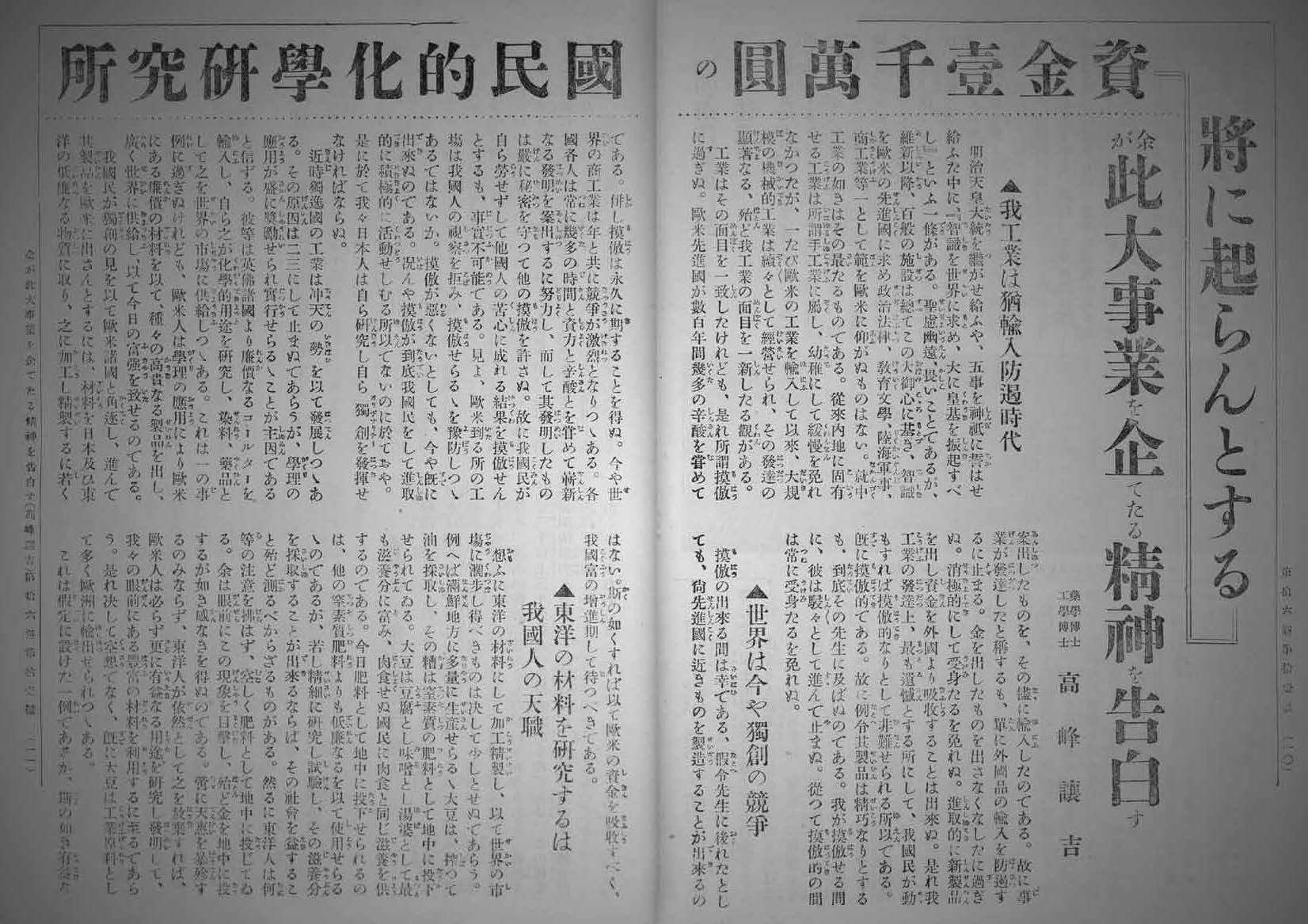 - 高峰譲吉の国民的科学研究所の提案書:「実業の日本 第16巻第11号」大正2年5月15日発行
